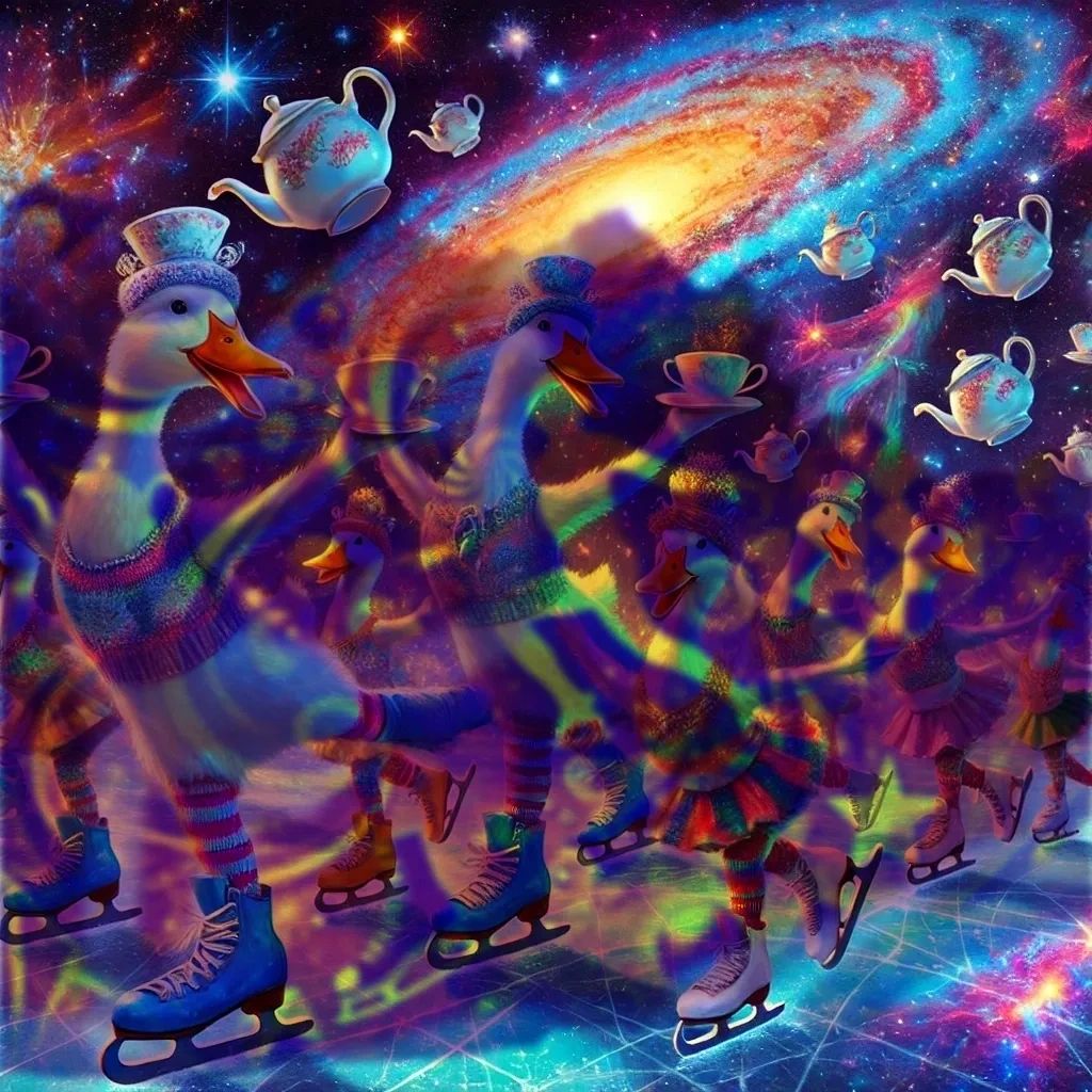 The image of "cosmic ducks on ice" is particularly evocative. It captures the feeling of navigating the universe with a sense of lightheartedness and wonder, even amidst the inherent absurdity of existence. It suggests that we are all on a journey of discovery, wobbling our way through the cosmos with a smile and a quack.